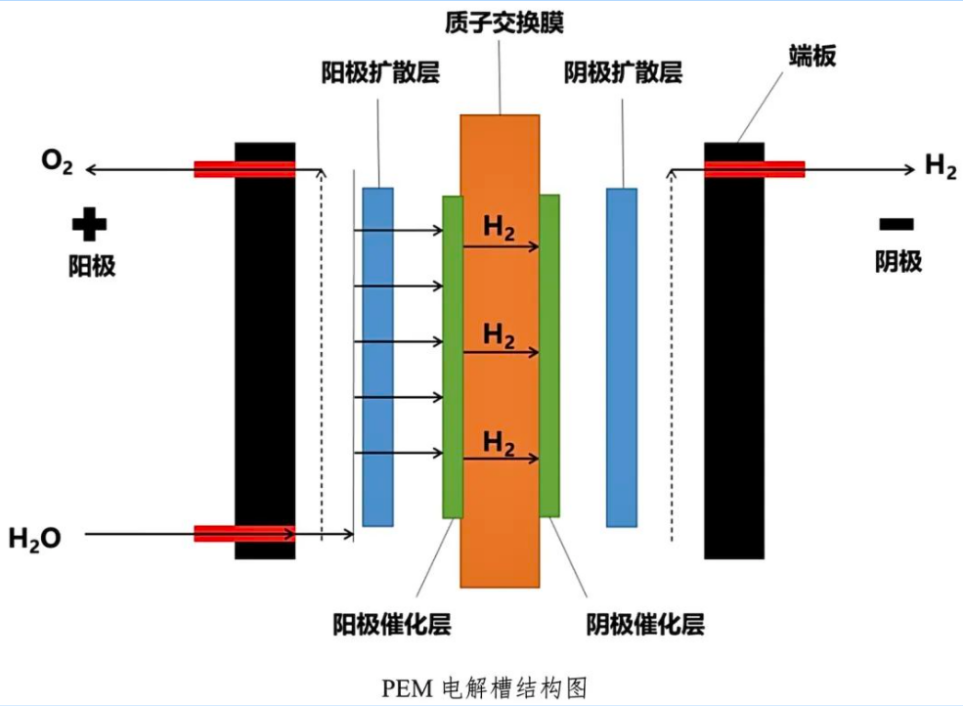 质子膜电解水制氢技术采用质子交换膜作为隔膜,无液态电解质。该技术是指使用质子(阳离子)交换膜作为固体电解质替代了碱性电解槽使用的隔膜和液态电解质(30%的氢氧化钾溶液或26%氢氧化钠溶液),并使用纯水作为电解水制氢原料的制氢过程。