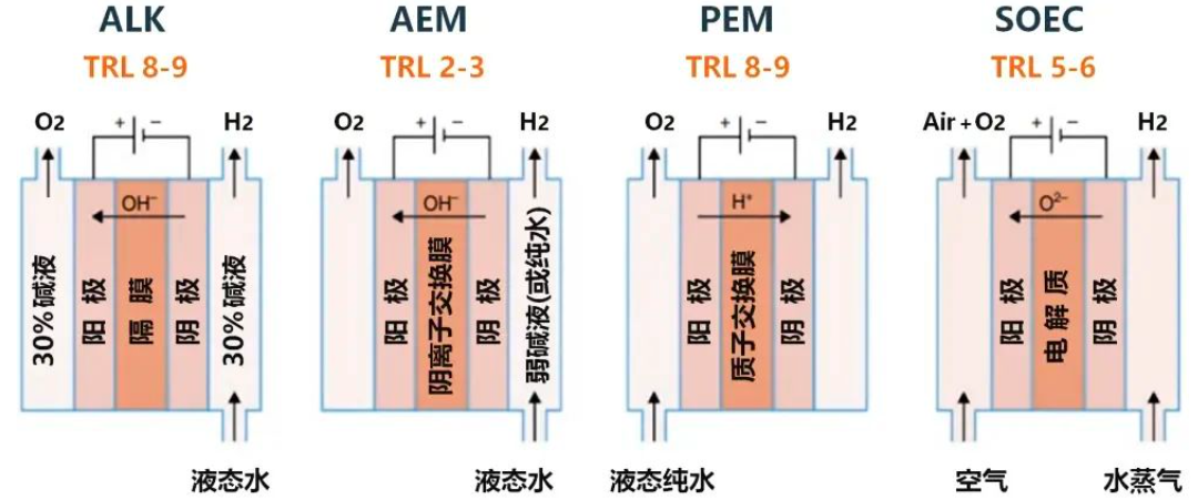 根据所使用电解质(导电离子传输的“载体”)不同,电解水制氢技术主要分为碱性电解水制氢(ALK)、质子交换膜电解水制氢(PEM),阴离子交换膜电解水制氢(AEM)、固体氧化物电解水制氢(SOEC)四种。