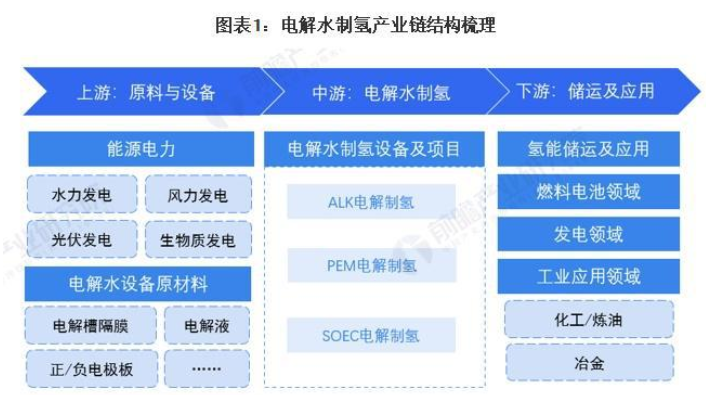 电解水制氢上游行业包括:能源电力与电解水制氢设备原材料,包括电解槽隔膜、电解液、正/负电极板等;中游为电解水制氢设备及建设项目,其主要工艺包括ALK/PEM/SOEC;下游主要包括氢能储运、燃料电池、工业应用、发电等应用领域。