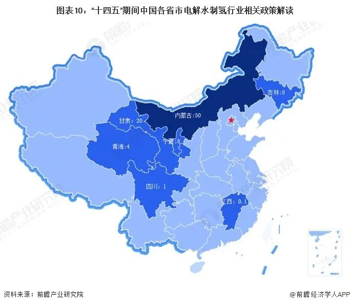 目前内蒙古自治区、甘肃省、宁夏回族自治区、吉林省、四川省成都市、青海省和江西省都在相应的政策中明确了2025年可再生能源制氢产量,合计年产量为91.1万吨,远远超过了国家发改委在国家氢能规划中提及的2025年可再生能源制氢年产量目标,也体现出了中国电解水制氢的巨大潜力。