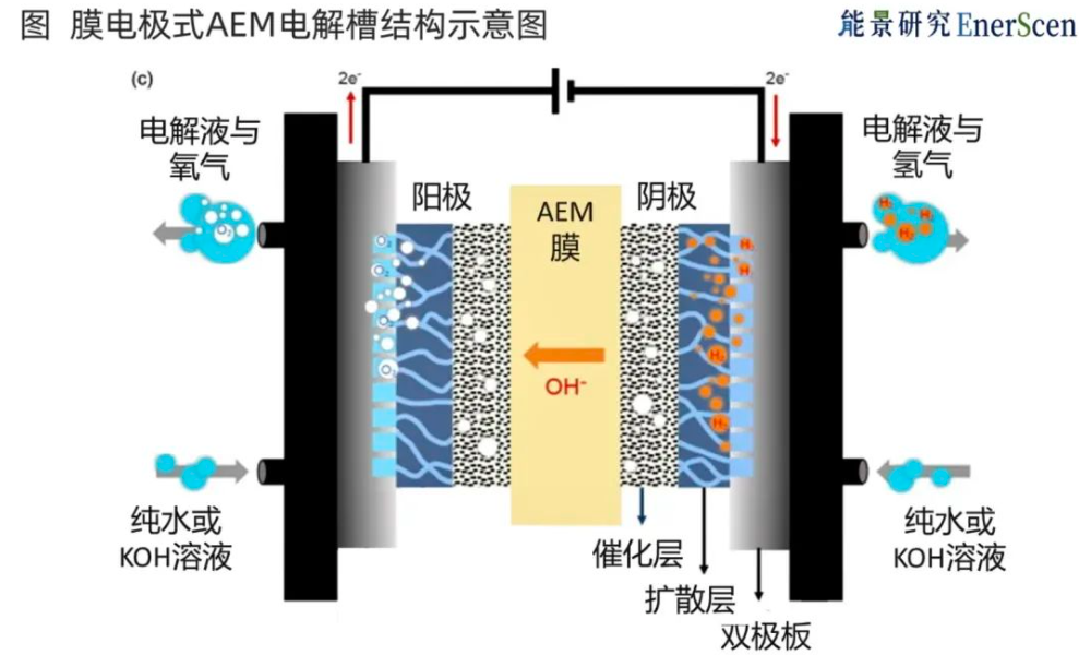能够生产低成本、高效的氢气,需突破关键材料技术限制。电解槽结构类似于PEM电解槽,主要由阴离子交换膜、过渡金属催化电极极板、气体扩散层和垫片等组成,常使用纯水或低浓度碱溶液作为电解质。阴离子交换膜可以传导氢氧根离子,并阻隔气体和电子直接在电极间传递。AEM电解水技术工作原理为,水从阳极过阴离子交换膜到阴极,接受电子产生氢气和氢氧根离子,氢氧根离子穿过阴离子交换膜到阳极,释放电子生成氧气。氢氧根穿过阴离子交换膜回到阳极并放出电子产生氧气,氧气随后通过气体扩散层与电解液一起流出。AEM电解水技术使用廉价的非贵金属催化剂和碳氢膜,具有成本低、电流密度较大、环保高效等优点,并且可以有效地与可再生能源耦合。