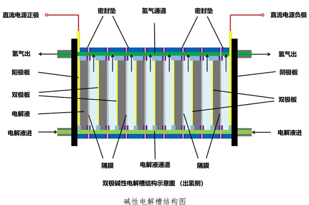 碱性电解槽主体由端压板、密封垫、极板、电板、隔膜等零部件组装而成,电解槽包括数十甚至上百个电解小室,由螺杆和端板把这些电解小室压在一起形成圆柱状或正方形,每个电解小室以相邻的2个极板为分界,包括正负双极板、阳极电极、隔膜、密封垫圈、阴极电极6个部分。